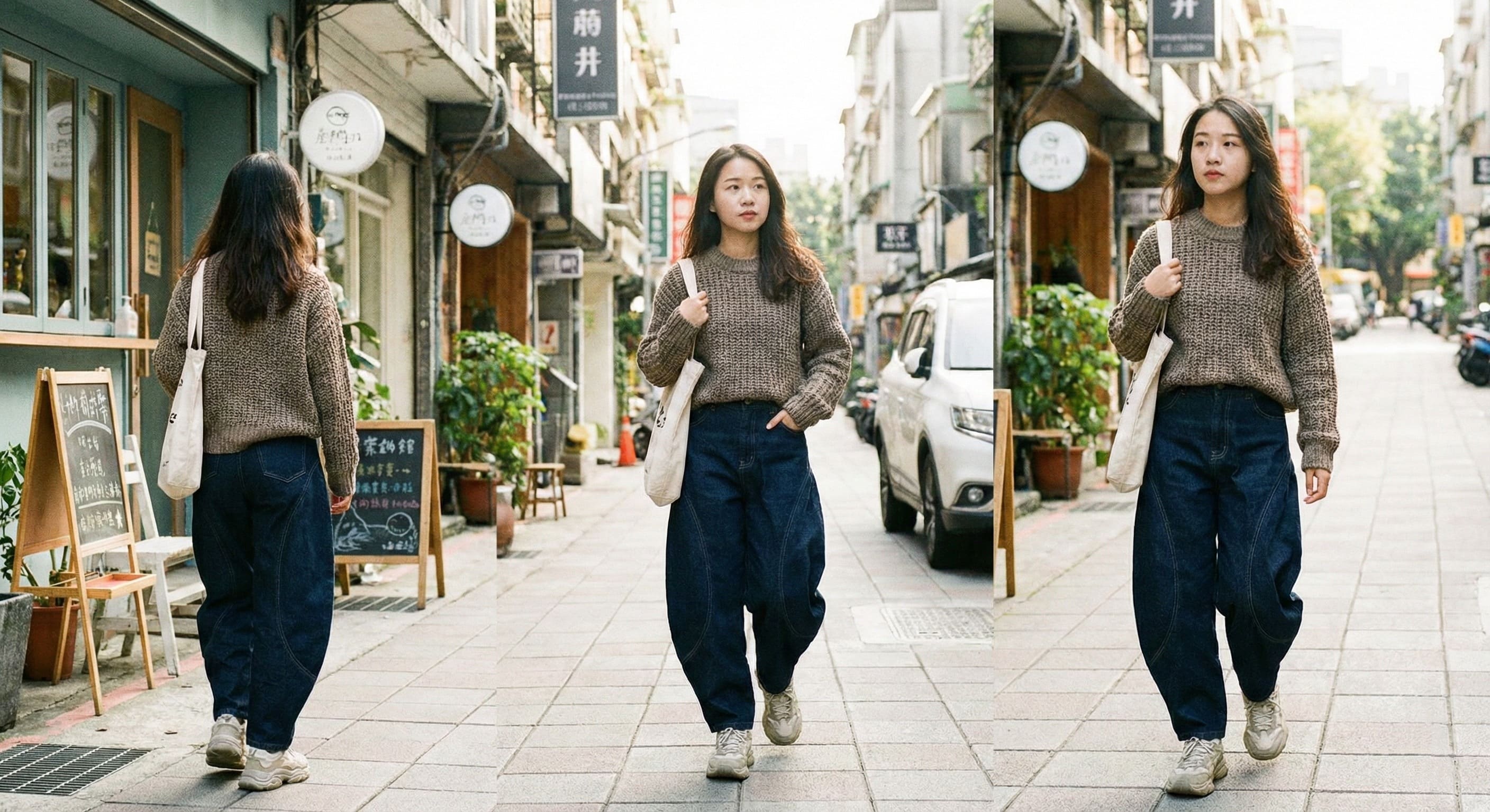 彎刀褲穿搭的精髓在於「廓形」。它在膝蓋處保留了寬鬆度,利用褲管外擴的弧度,直接「重塑」了腿部輪廓。